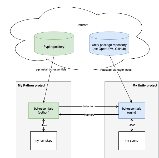 Bessy consists of two components, a Python back end and a Unity front end. These components are obtained from internet hosted package repositories and installed into your project (GitHub repos, etc):