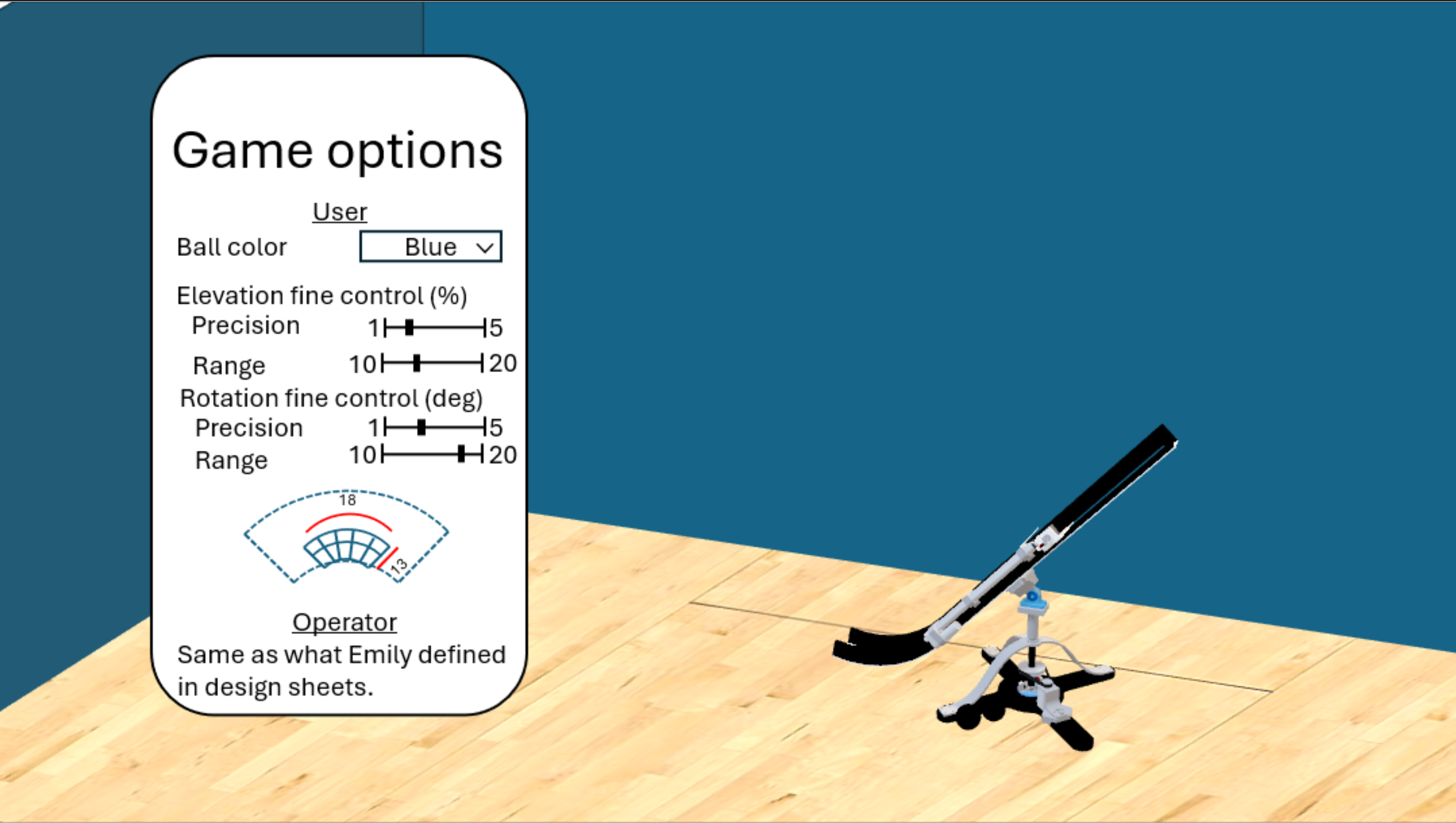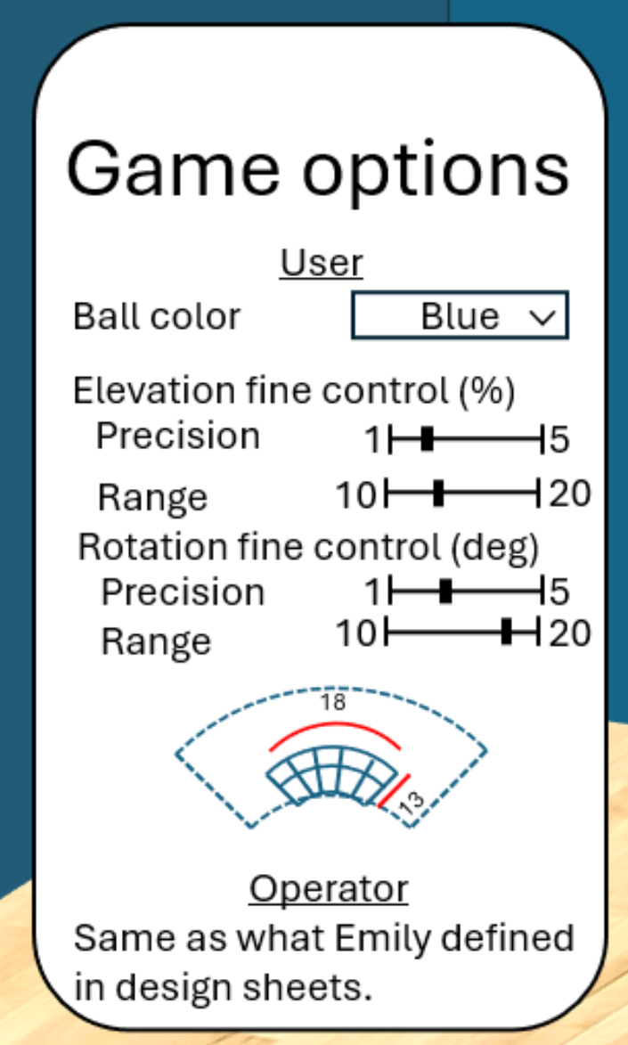 The game options menu is the only one that will get a major change. Here, the precise control options will include a slider to select discrete values (e.g., 1% changes) from a predefined range (Fig. 2). The “operator” section will remain the same as it was in the design documents that Emily put together.