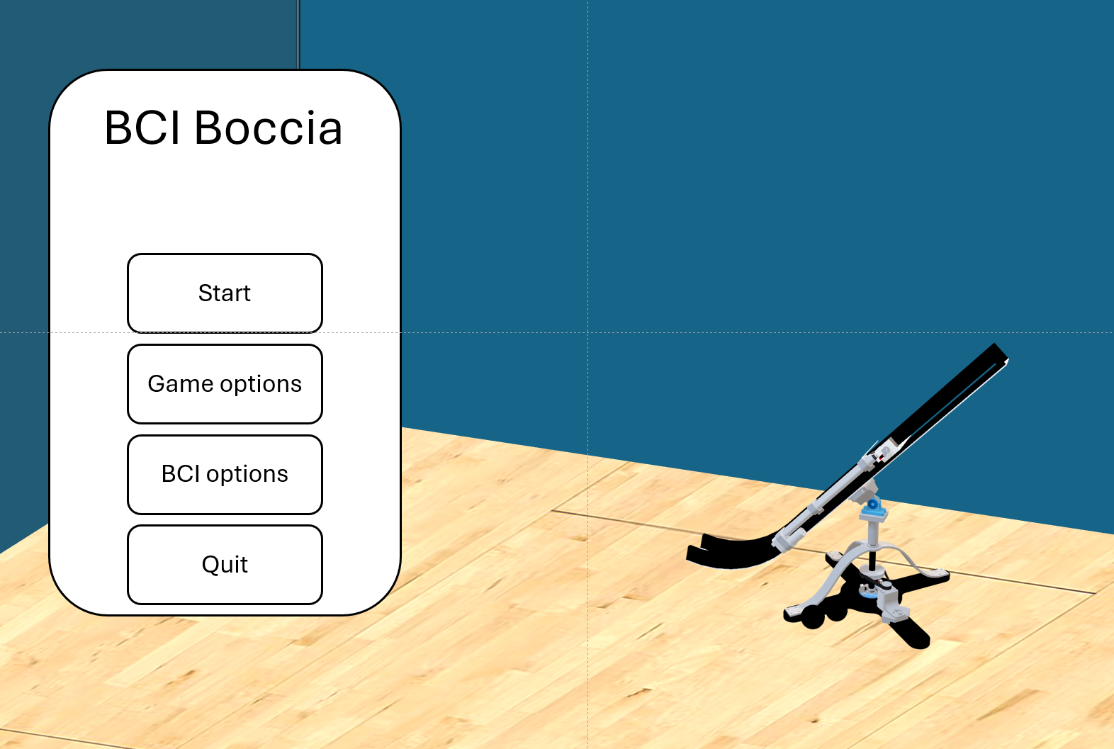 Menus and ramp will exist in world space in two different planes. for reference, the menus will be in a foreground, and the ramp will be in the background (Fig. 1). The panel with the “BCI Boccia” title would change to the “game options” or “BCI options accordingly”.