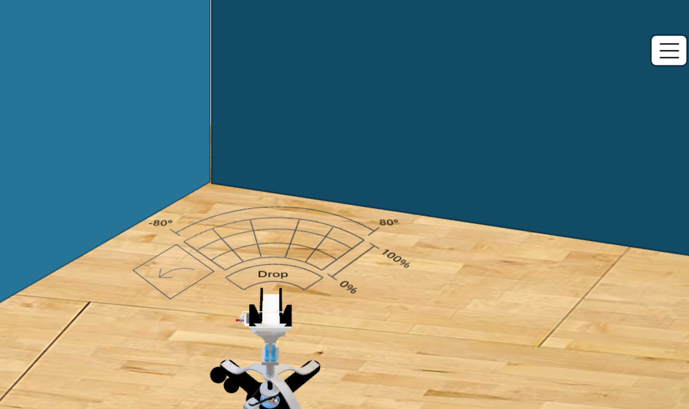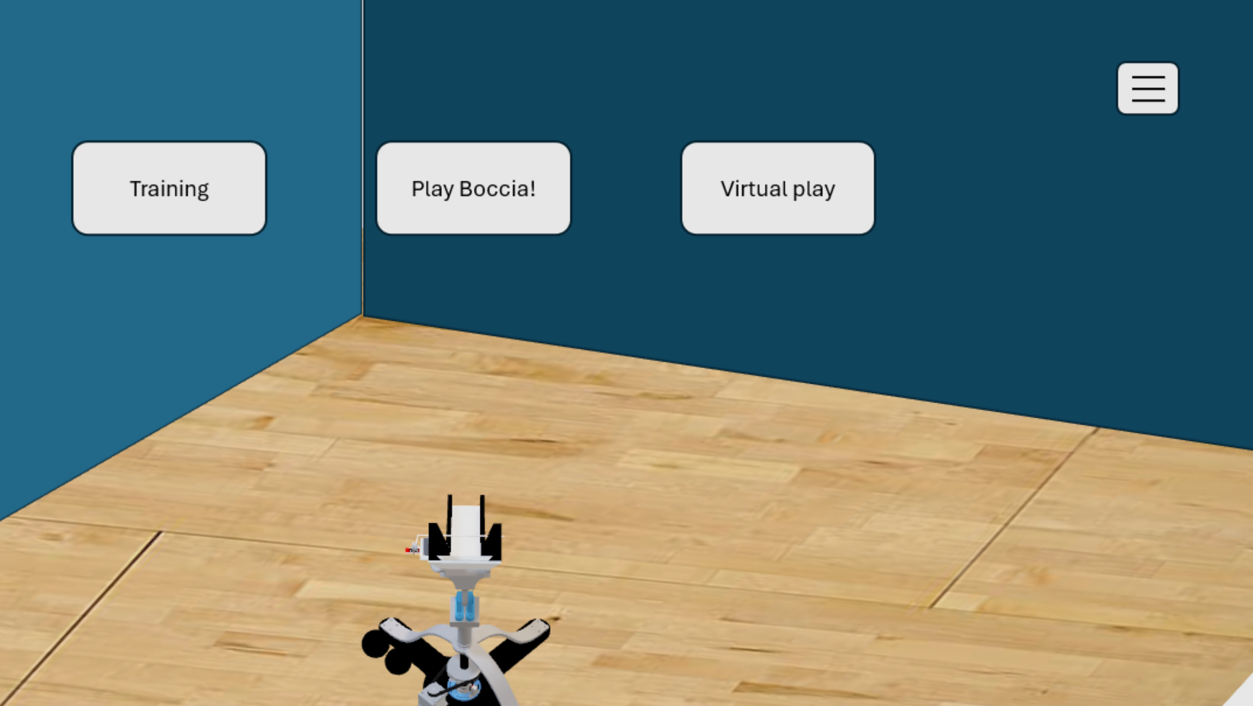 After pressing the start option in the main menu (Fig. 1), the camera will fly to the “play” position (i.e., behind the ramp with a slight inclination downwards). There will be three menus in this screen and a persistent hambuger menu in the top right corner (Fig. 4). The idea is that the ramp is more centered here, but I was not able to do that in the mock up. Only the “training” button should be enabled. After training is done (as explained in the next step), the “Play Boccia!” and “virtual play” buttons are enabled.