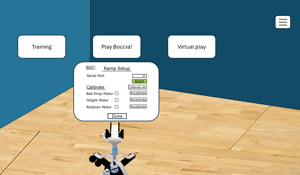 If the “Play Boccia” button is selected, a menu will extend from the “play Boccia” button to show the ramp setup (Fig. 6). This menu will allow the operator connect to the ramp through serial communication and calibrate the motors. If back is selected, we’ll go back to the play view (Fig. 4). If Done is selected, we’ll go to a view like the training view (Fig. 5), the difference is that now there should be no training done, instead the player will be able to control the ramp using BCI.