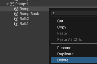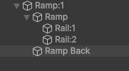 - When Unity imported the file, it added an extra child component for each of the four main sections. For example, the “Ramp:1” parent component had an extra “Ramp” child component underneath it. And the two ramp rails and the backing were all child components of the “second” Ramp component.