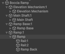 Below is the complete Hierarchy of the simplified ramp model. At most, the model has up to four levels of child components, with as few individual parts as possible.