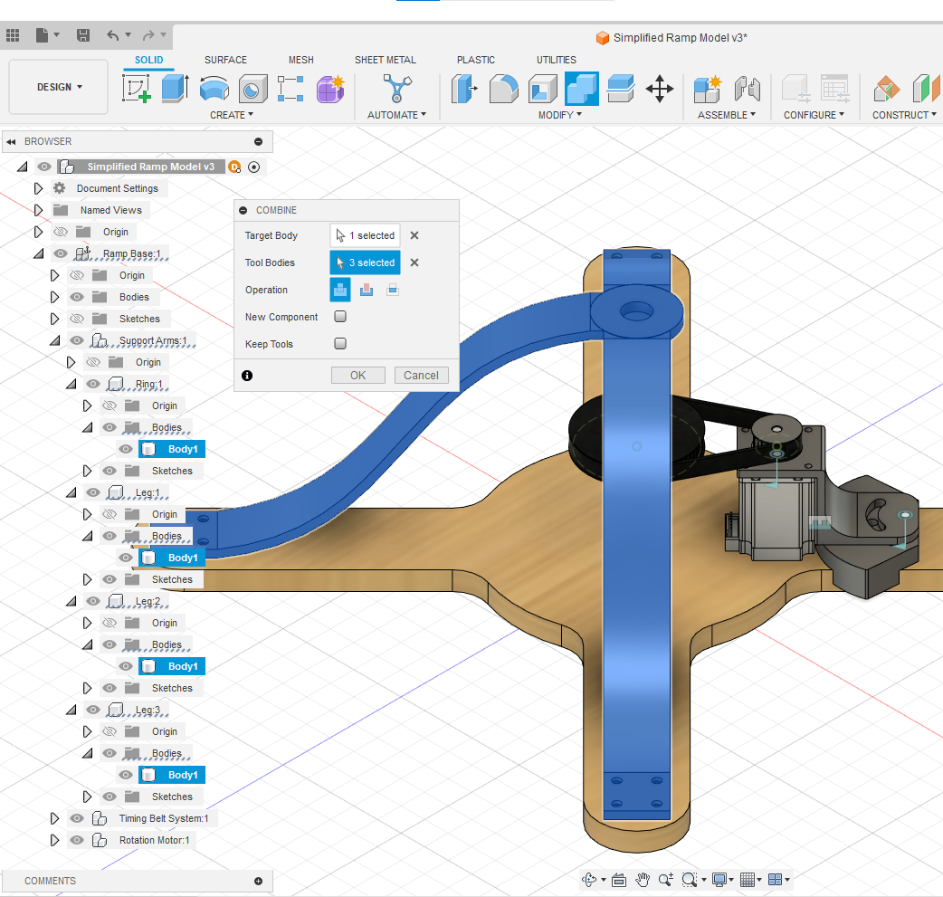 - In a blank Fusion360 file, I started by inserting the design file of the wooden base and then went from there to insert the other ramp components.