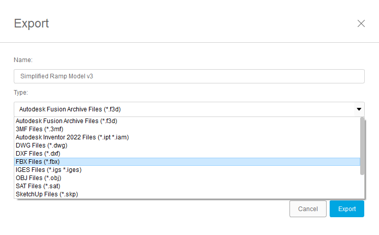 - Export the simplified ramp model from Fusion360 as a .fbx file.