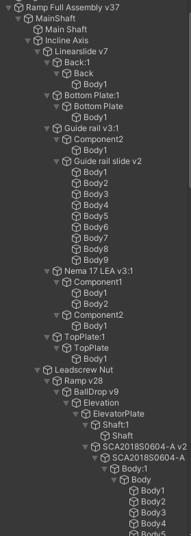 The original Unity ramp model was overly complicated. This is part of the Hierarchy of the old ramp model in Unity. Importing directly from the Full Assembly CAD file resulted in a messy and complex model with many more individual parts than necessary and a Hierarchy with as many as eleven or twelve levels of child components. (This isn’t even the whole Hierarchy)