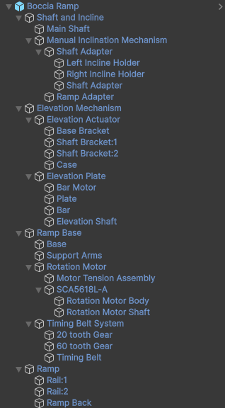 - (The simplified model as of September 4, 2024 is organized into four “sections” as the main parent components: Ramp Base, Main Shaft (which includes the incline parts), Elevation Mechanism, and Ramp.)