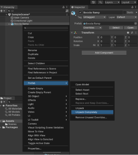 - Right-click on the model name in the Hierarchy and select Prefab > Unpack Completely. (This will let you rearrange components in the Hierarchy for further simplification).