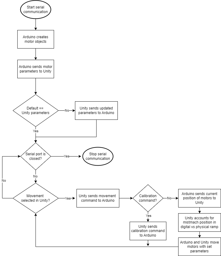 - The benefit of doing this approach is that the Arduino will not have to send as many Serial commands as in case 1. Additionally, this could help the Unity program avoid the drawback where the expected position by Unity is not the actual position of the physical ramp.